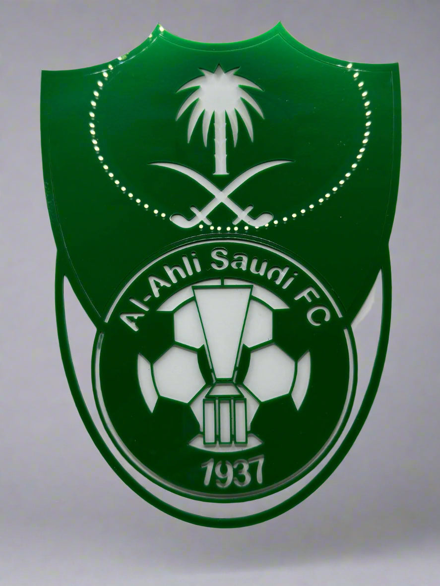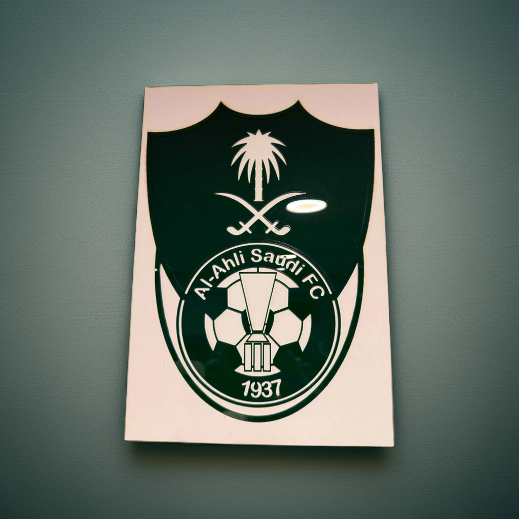 At its heart, an acrylic club emblem takes center stage, precision laser-cut for crisp, intricate detailing. This glossy, polished piece shines brilliantly, reflecting light in a way that enhances its bold presence. The emblem stands slightly raised, creating a dynamic three-dimensional effect that commands attention.